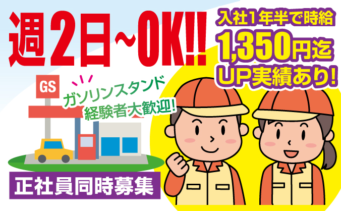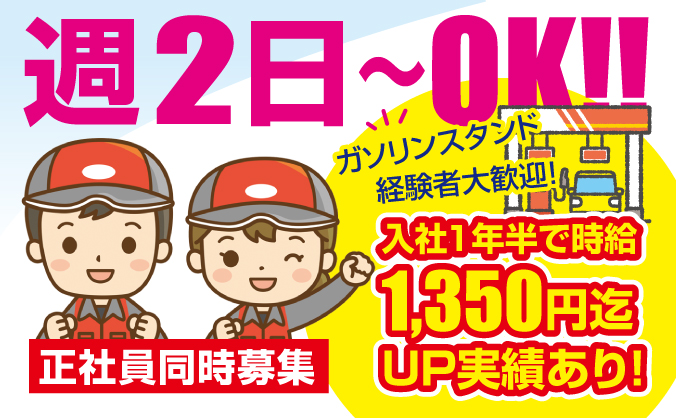 【未経験OK/週2日〜】ガソリンスタンドスタッフ|時給1,100円〜|高校生OK
